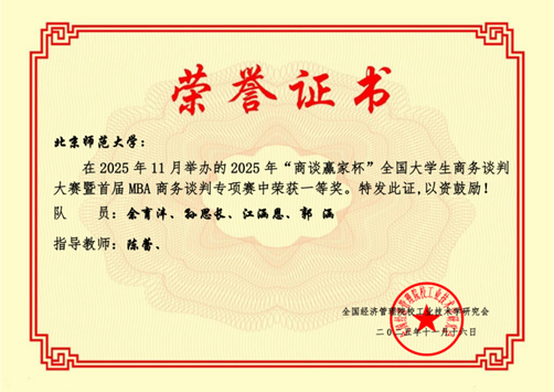 2025年11月9日,由全国经济管理院校工业技术学研究会沟通与谈判委员会主办的2025年“商谈赢家杯”全国大学生商务谈判大赛圆满落幕。在此次大赛的网络赛本科组角逐中,由北京师范大学湾区国际商学院本科生江涵恩、郭涵,与校内其他优秀学子余育沣、孙思长共同组成的“我说的都队”表现优异,荣获本科组一等奖。团队成员江涵恩、孙思长凭借出色的个人表现荣获“优秀谈判手”称号,指导教师陈蕾教授荣获“优秀指导老师”奖。