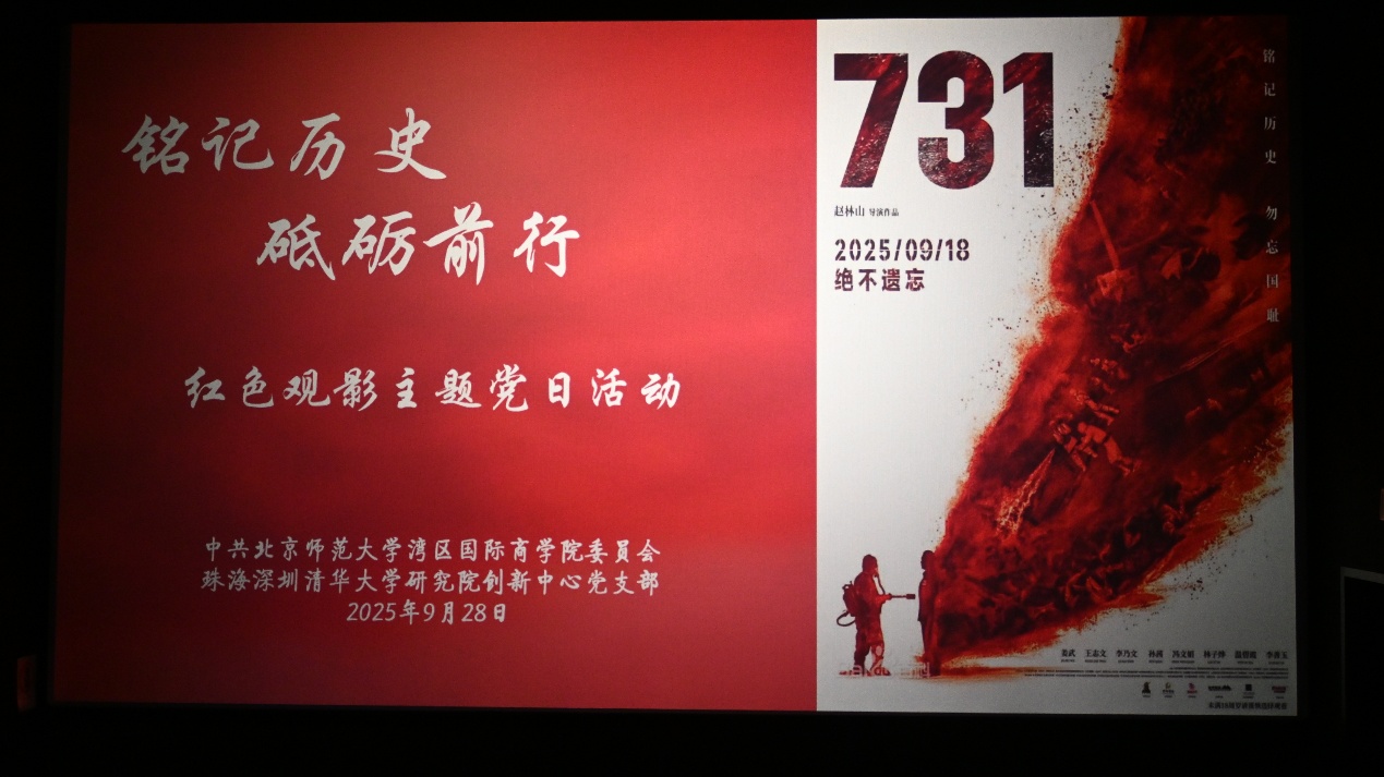 在纪念中国人民抗日战争暨世界反法西斯战争胜利80周年、喜迎中华人民共和国成立76周年之际,北京师范大学湾区国际商学院党委联合珠海深圳清华大学研究院创新中心党支部,于9月28日在格力海岸海上影城成功举办红色观影主题党日活动。50余名师生党员齐聚一堂,共同观看历史题材电影《731》,在光影叙事中重温峥嵘岁月,凝聚奋进力量。