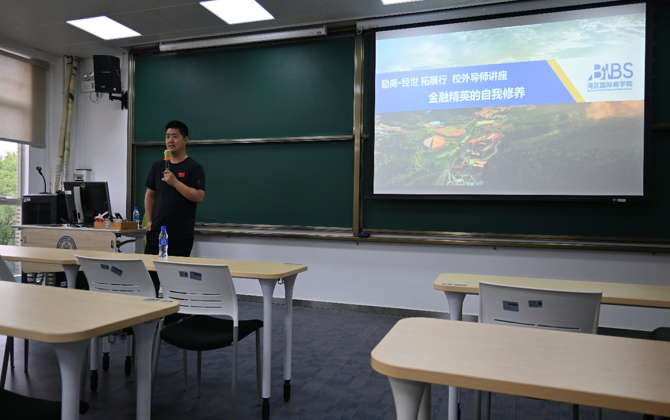 为了帮助商科学子提升职业素养与综合能力、明晰职业发展路径,4月8日下午,湾区国际商学院举办“励商·经世”拓展行校外导师讲座,邀请招商证券资深从业者、北师大深圳校友会副会长张亮先生做“金融精英的自我修养”主题讲座。学院70余名全日制专业硕士学生参加,活动由于雯老师主持。