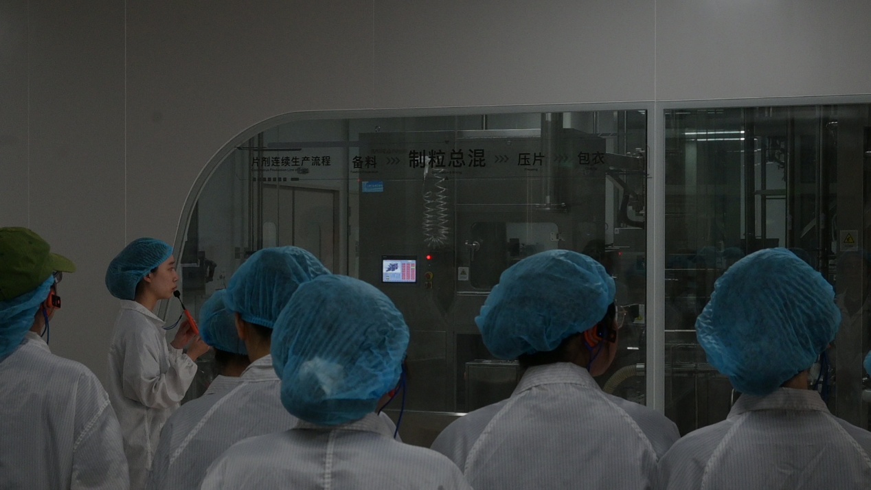 在透明工厂的核心区域,研制八年的片剂与蛋白粉连续生产线全景呈现在师生眼前。从备料、制粒到压片、包装,九大生产环节环环相扣。同学们漫步于玻璃栈道之上,亲眼见证了鱼油、钙片、蛋白粉等产品“从粉末到胶囊”的完整旅程。厂区内最醒目的标语——“诚信比聪明更重要”,在每一个透明环节中得到完美诠释,给师生们带来了深刻的启示。